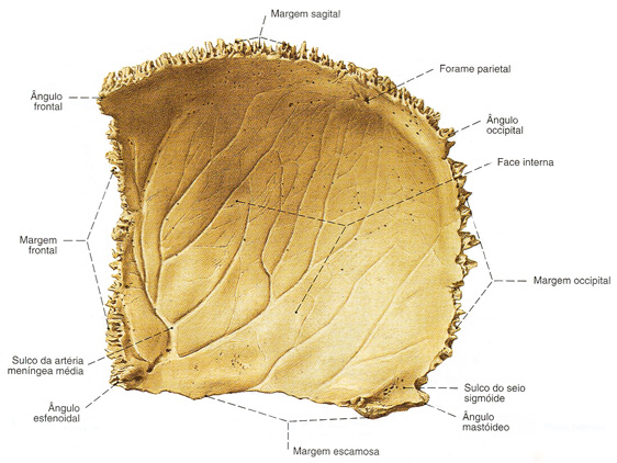 É um osso par. Os dois ossos parietais formam os lados e tecto da calota craniana. É aplanado, quadrangular e apresenta uma superfície externa convexa e uma interna côncava; 4 bordas e 4 ângulos.